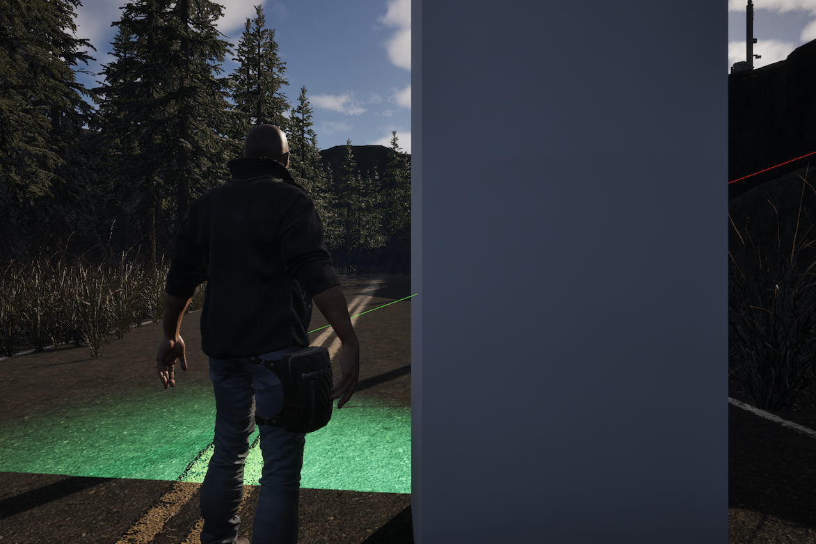 Here, the green segment of the line cast indicates an obstacle was hit, so the player is not indicated as spotted. The green light supports this.
