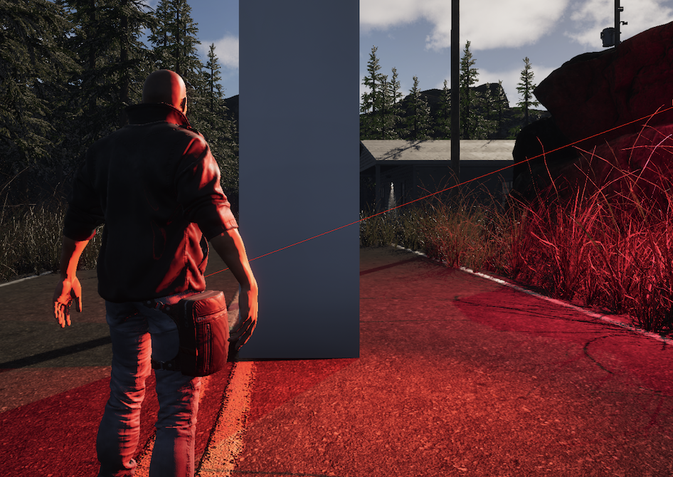 Here, the line cast from the camera can be seen, showing the player has been spotted. This is further indicated with the red light.