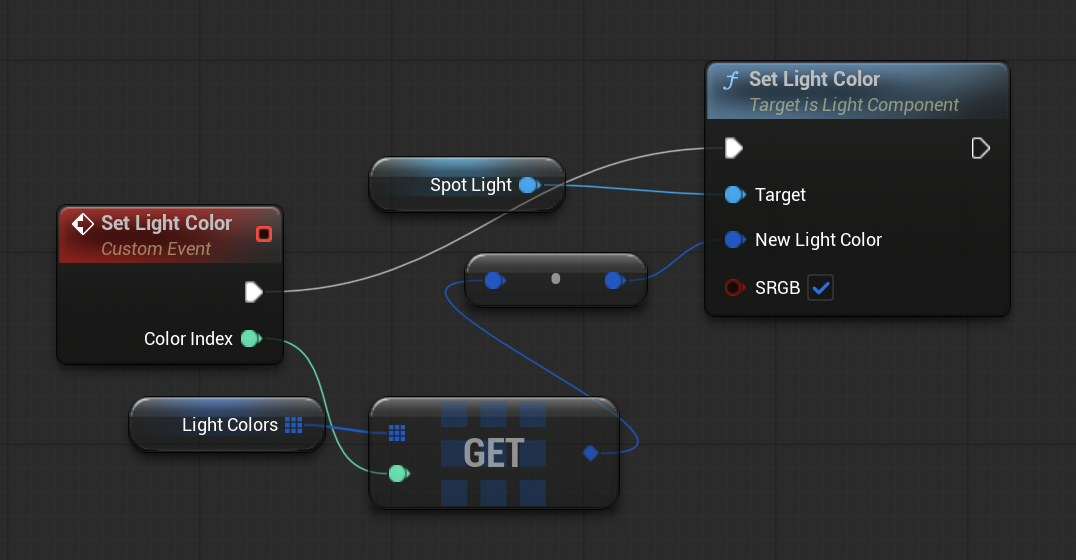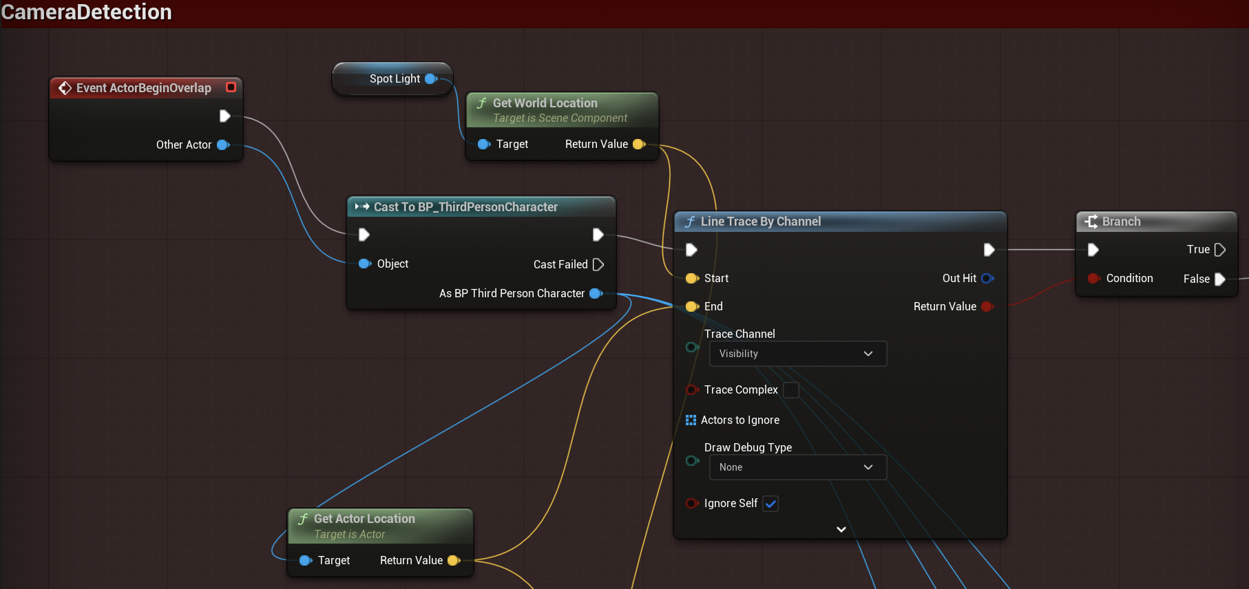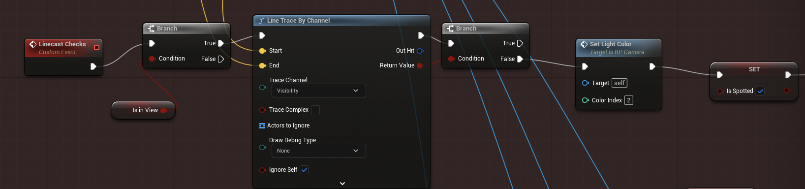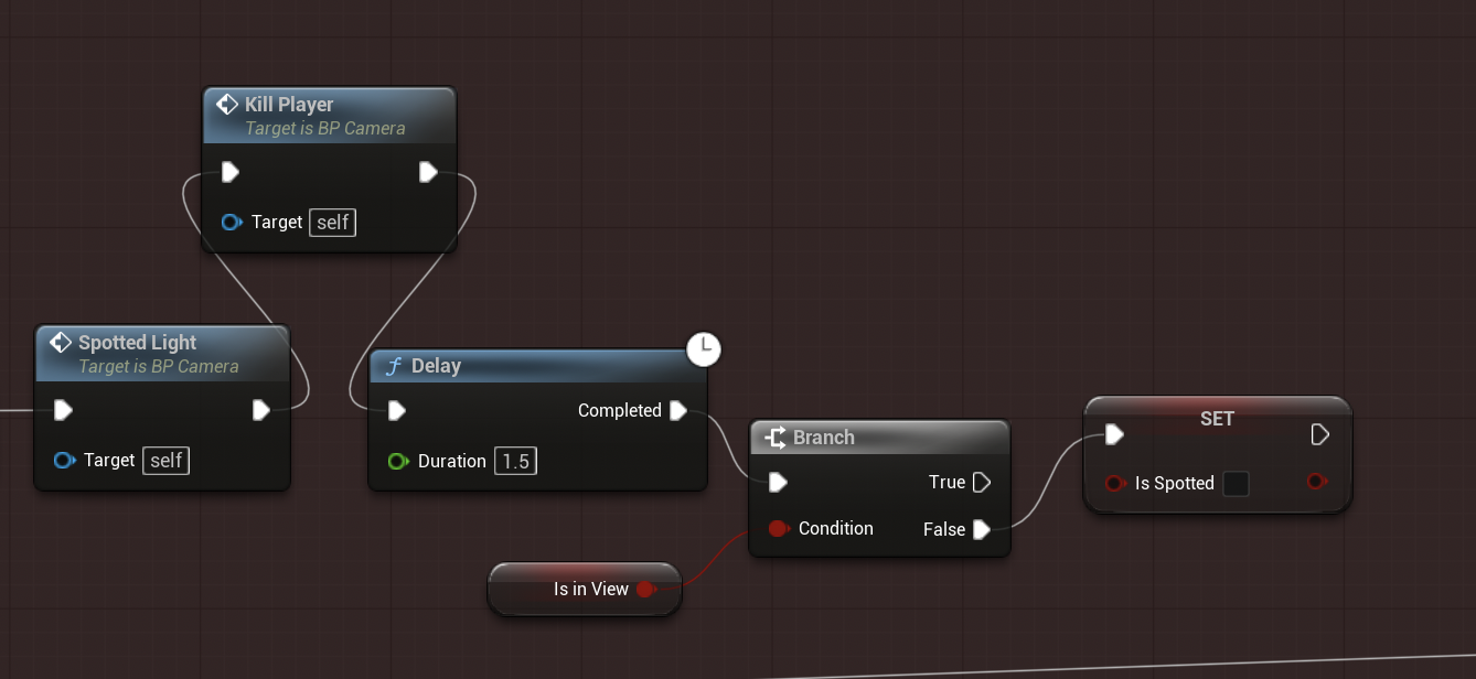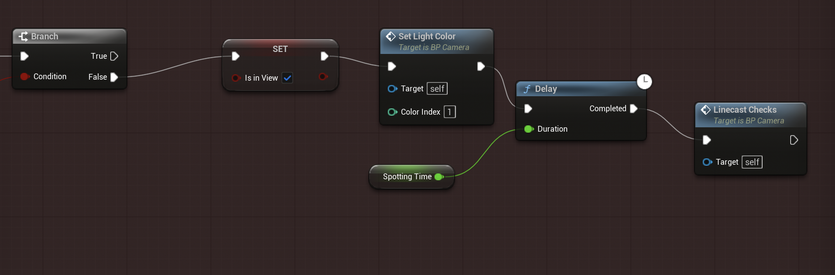 I created a variable called "Is in View" and set it to true when the player is detected. I then called a custom function to change the color of the camera light to tell the player that they're in the camera view. I then added a delay so the player doesn't get caught instantly when entering the camera's view and then move on to a secondary line of sight check.