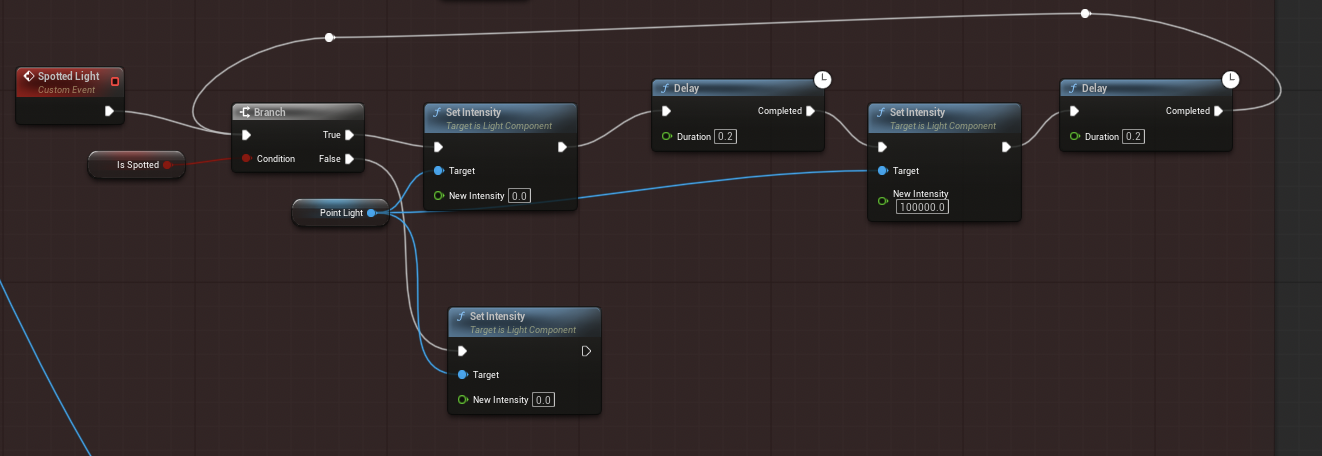 This then checks the "is in view" variable and shoots another line cast after the short delay to see if the player stayed in the sight of the camera. If so, I made a "is Spotted" variable which is set to true. The light color is also set to red to tell the player they've been spotted.