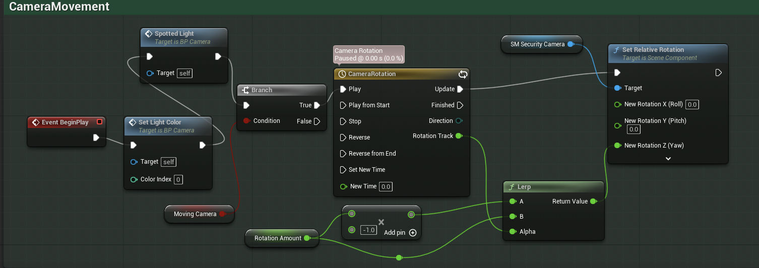 Then, to make the camera move, I added a timeline that goes back and forth between two values and used it to blend between two rotation values. This creates a convincing camera scanning movement.